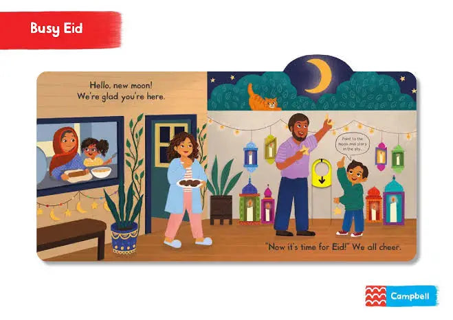 Push, pull and slide the tabs as children prepare for Eid celebrations in Busy Eid! Join them as they decorate the house, wrap presents for their friends and enjoy a delicious feast!